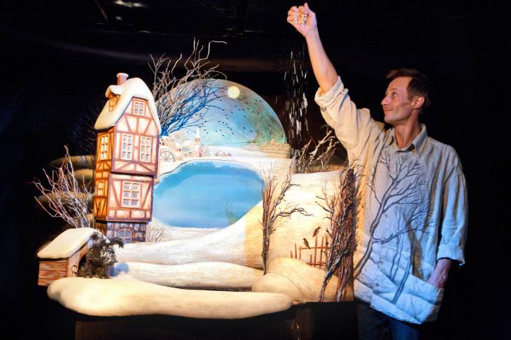 Это камерный спектакль для одного актера и множества кукол. Спектакль настолько выразительный, что можно почувствовать снежную свежесть морозного ветра, ласковое тепло кухонного очага, аромат весны, и даже – увидеть наяву мечты влюбленного Снеговика. Кукольная декорация, сделанная руками мастера, становится маленькой Вселенной, наполненной всевозможными превращениями. Кукольник, лирично и трогательно рассказывающий эту андерсеновскую сказку – актер, смешивающий печальное и смешное, – каждый раз по-новому завораживая зрителя.