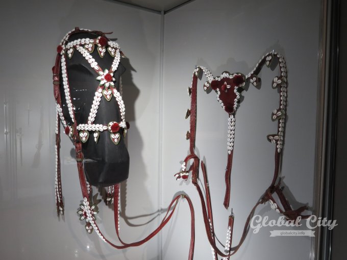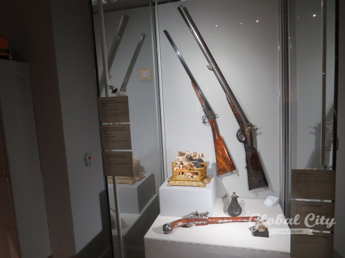 Выставочный зал при помощи витрин поделен таким образом, что посетители могут ходить по кругу. Экспонатов много, но сотрудники музея разместили их так, что ни о каком нагромождении не может быть и речи – все органично и изящно. Рядом с трехметровым ружьем-«уточницей», с помощью которого вспугивали водоплавающих птиц, можно увидеть живописные картины и посуду с иллюстрациями охоты, а чуть подальше – вещи, принадлежавшие Екатерине II. Это седельно-сбруйный комплект цесаревны, который легко превращался из дамского в мужской – Екатерина II обожала быструю верховую езду и не любила дамские седла. Каждый раз, едва отъехав от дворца и оказавшись вне видимости императрицы, она пересаживалась по-мужски. При этом универсальный гарнитур оставался очень нарядным – обтянут малиновым бархатом, а вышивка исполнена золотом, сама же конская сбруя украшена настоящими ракушками.