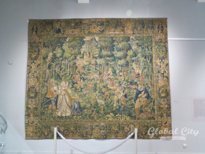 На нескольких стенах зала можно увидеть шпалеры – безворсовые настенные ковры с сюжетными изображениями. Одной из них более шестисот лет – «Охоту на оленя» соткали из шерсти, шелка и золоченных нитей в Германии в XV веке, а «Охоту на буйвола» во Фландрии в XVI веке.