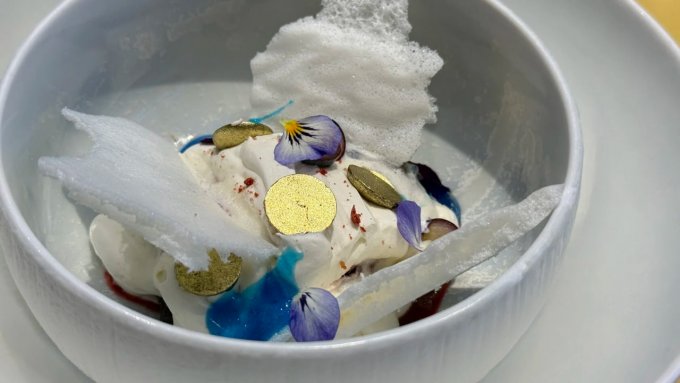 «В ресторане Kitchen шеф взял яблоки за основу и приготовил их в десерте разными способами: воздушное облако, хрустящая текстура, повидло, на сливочном масле и яблочная карамель. Так постарались воплотить в десерте подход Казанцева».