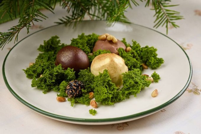 «В ресторане «Паштет» на десерт предлагают три конфеты, которые шеф-кондитер Елена Юртова посвятила теговой надписи города, созданной для Уральской индустриальной биеннале современного искусства Тимофеем Радей: «Кто мы, откуда, куда мы идем». Ее можно увидеть с берега городского пруда на крыше бывшего Приборостроительного завода, который находится недалеко от ресторана. Одна из конфет – это про прошлое: «От куда» – конфета из темного шоколада с черемухой, миндальной мукой и брусникой в начинке. Настоящее – «Кто мы» – это молочный шоколад, внутри с белым шоколадом и сосновой шишкой. Будущее – «Куда мы» – взрывной белый шоколад с облепихой. Конфеты подаются на подушке из мха и кедровым орехом».