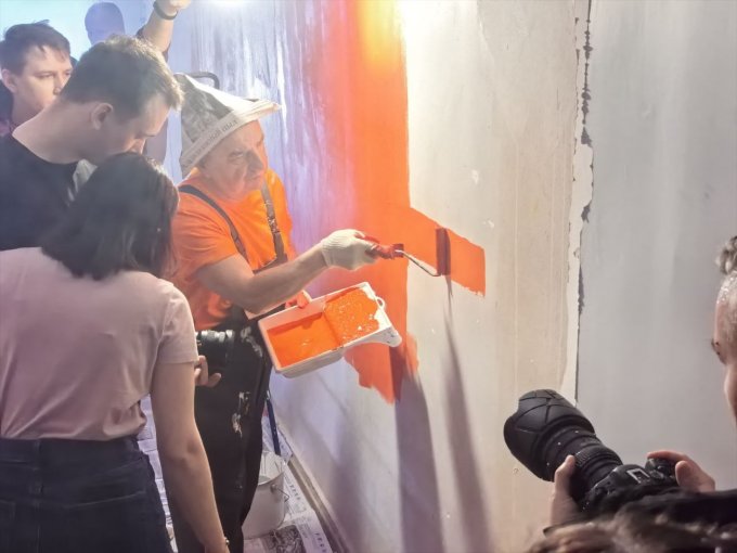 Чтобы закрепить эту связь с пространством, музыканты решили буквально воплотить строчки из песни в жизнь. Владимир Шахрин, строитель по первой профессии, взял в руки валик и вместе с коллегами покрасил одну из стен кластера в фирменный оранжевый цвет группы.