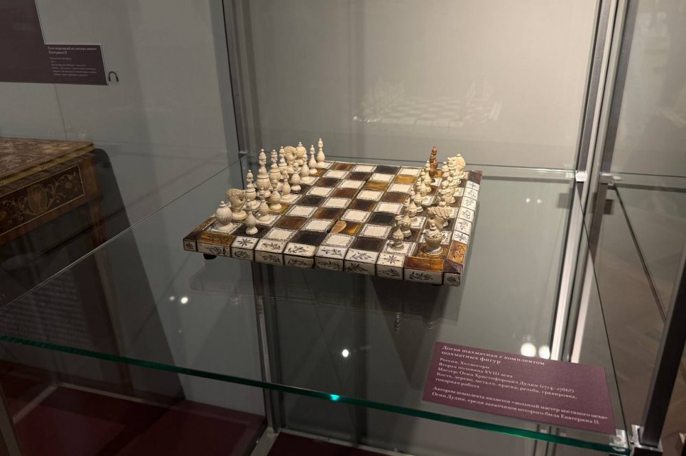 Вот шахматная доска, которая показывает, как Екатерина проводила досуг, играя не только в шахматы, но и в карты, бильярд, бирюльки. Наряды императрицы показывают ее любовь к русской культуре. Рабочий стол и письменные принадлежности демонстрируют деятельность Екатерины, которая любила работать. Чтобы раскрыть личность самодержицы, кураторы разместили по залу ее цитаты.