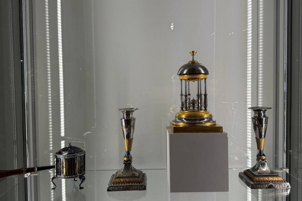 Первая экспозиция – «Екатерина Великая. Блеск престола» – погружает зрителя в будуар императрицы. Здесь личные вещи Екатерины Великой – камеи, которые она так любила; шкатулки с изображением ее внуков; шляпа, сапоги, мундирный костюм, веера; десятки портретов близкого окружения императрицы; письменные приборы, сделанные на заказ, личные печати. Через эти вещи зрители погружаются в мир Екатерины, знакомятся с ней ни как с хрестоматийным персонажам, а как с реальным человеком, живущим три века назад.