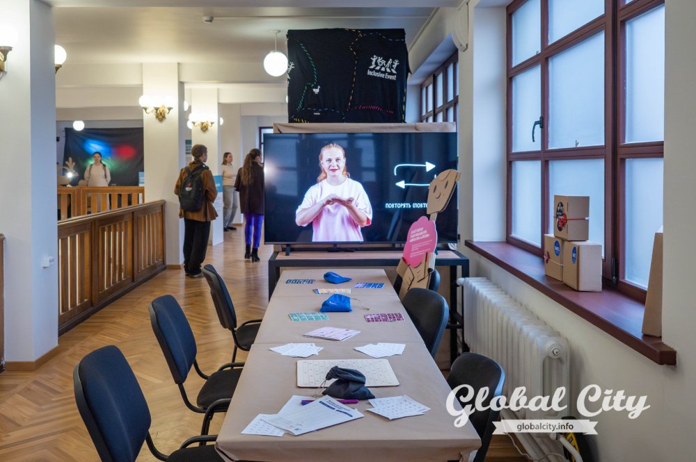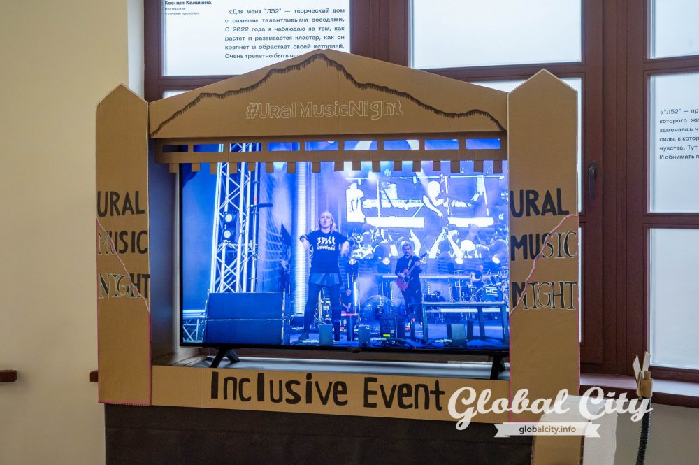 По всему периметру выставки разместили добро-роботов, которые встречают гостей экспозиции и рассказывают о жизни людей с особенностями. Здесь же можно увидеть сцены из картона, где на экране транслируют музыкальные open air фестивали, участие в которых принимают актеры-переводчики на русский жестовый язык. Актеры рассказывают, что подготовка к одному такому выступлению может достигать двух месяцев. За это время нужно перевести на жестовый язык и выучить каждую песню концерта, а еще поставить хореографию и разработать костюм. Все это необходимо для того, чтобы полностью погрузить глухого человека в музыкальную атмосферу.