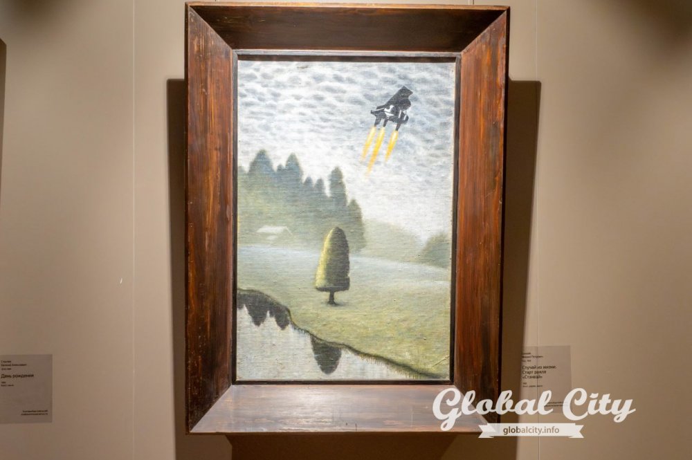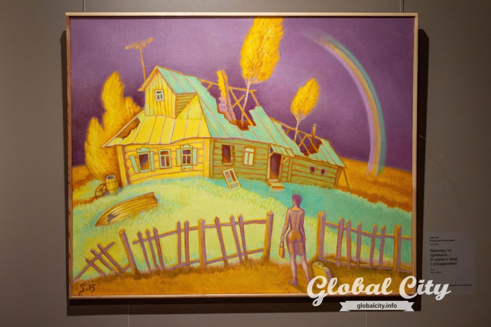 Трогательным акцентом выставки стал зал, посвященный памяти Владимира Михайловича Смелкова (1945–2025). Его работы, пронизанные добрым гротеском и театральностью, стали ключом к пониманию всей экспозиции. Смелков, долгое время работавший в ТЮЗе, режиссировал свои картины как маленькие спектакли, где на одном столе могут ужиться крошечный домик и гигантская буханка хлеба.