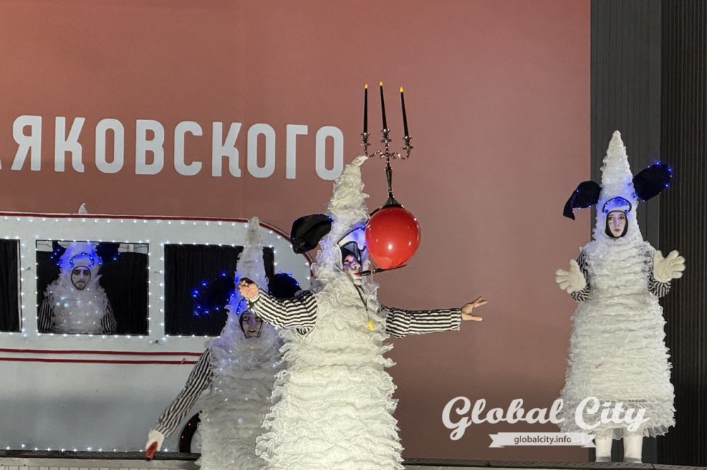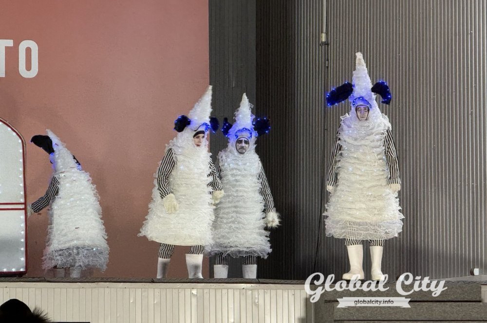 На сцене весь вечер пели песни и помогали зрителям включаться в активности Дед Мороз и Снегурочка. Также на главной сцене показали спектакль «Автобус чудес», главными героями которого стали белые елочки. Завершился праздник торжественно – все гости парка вместе с Дедом Морозом и Снегурочкой помогли зажечь огни на новогодней елке.