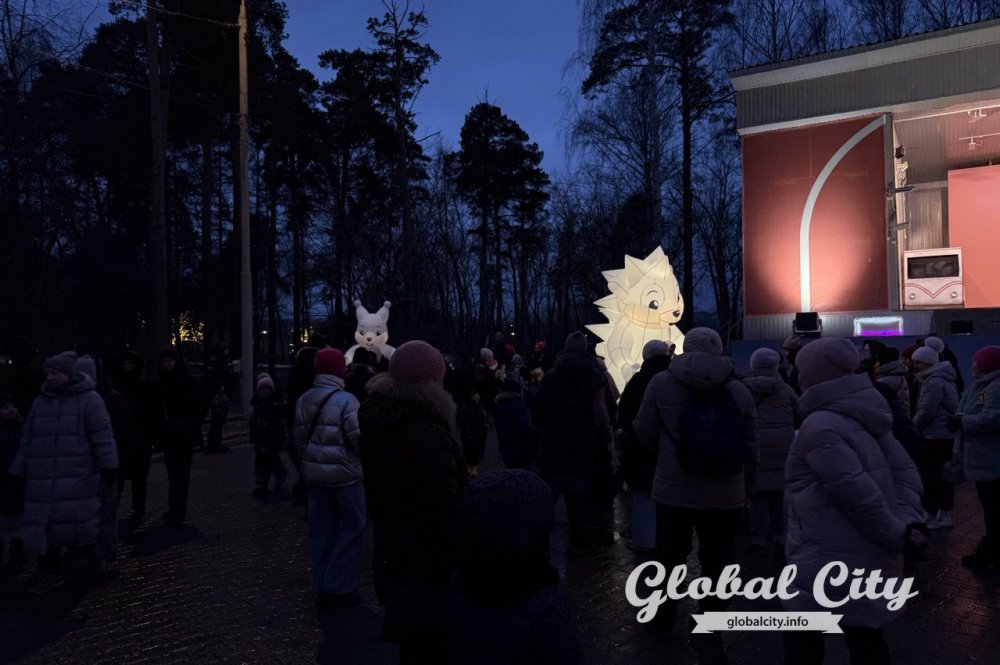 Началось представление с выхода гигантских светящихся фигур – белочки и ежика, которые активно общались с посетителями парка и фотографировались со всеми желающими, в числе которых были не только дети.