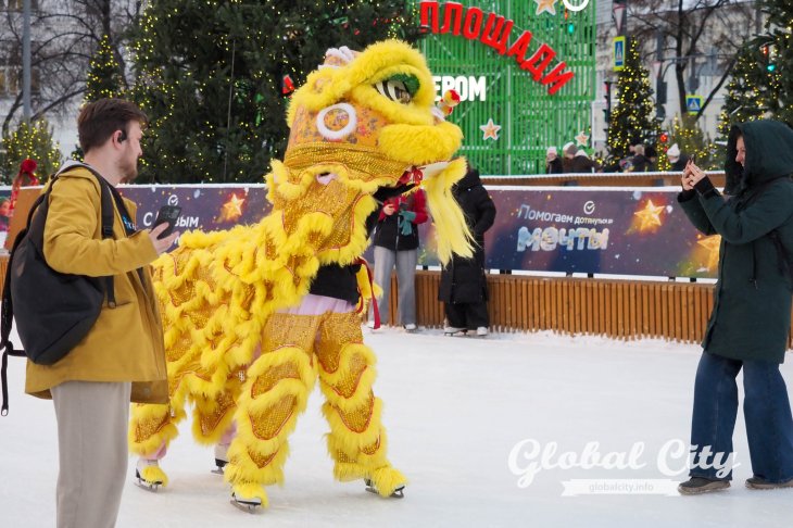 На льду среди посетителей катался желтый китайский дракон. Это фигура в китайской мифологии и культуре, которая символизирует силу, мудрость и могущество императорского Китая.