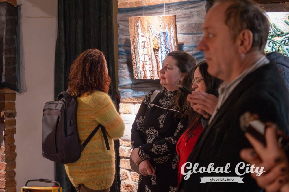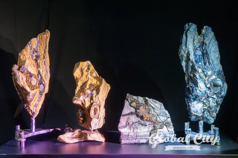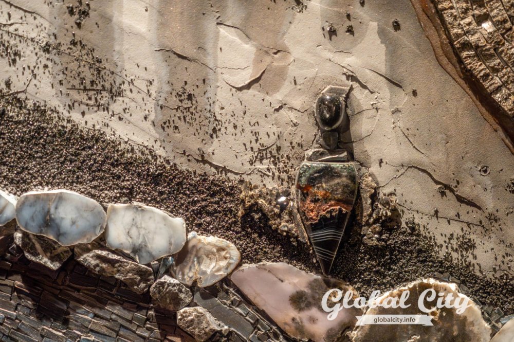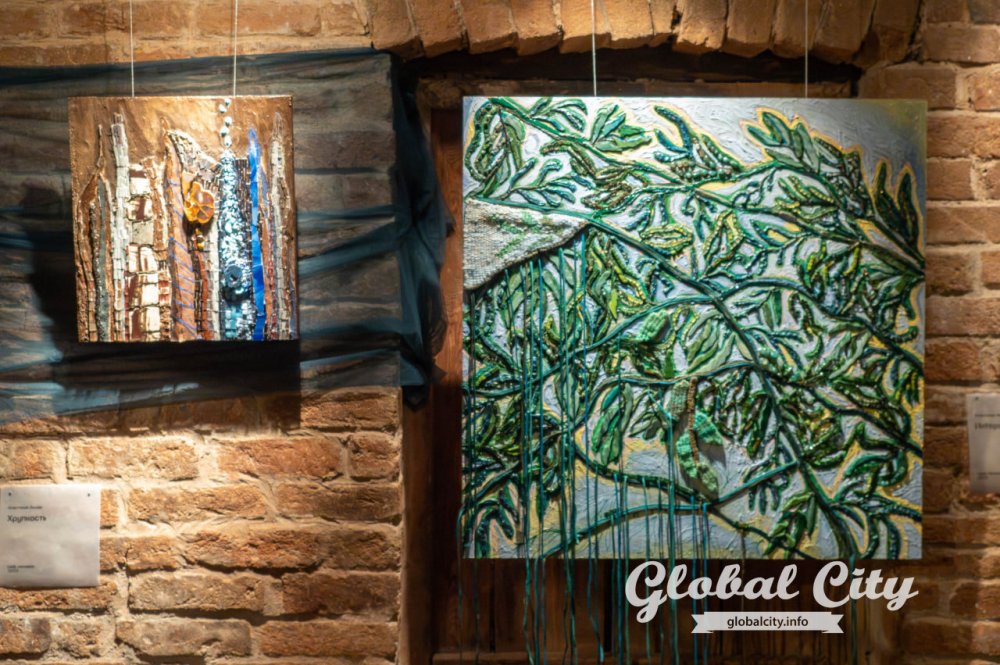 Над выставкой работали пять авторов. Ключевой техникой стала мозаика, где натуральные камни соседствуют с материалами апсайклинга.