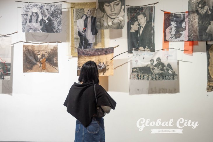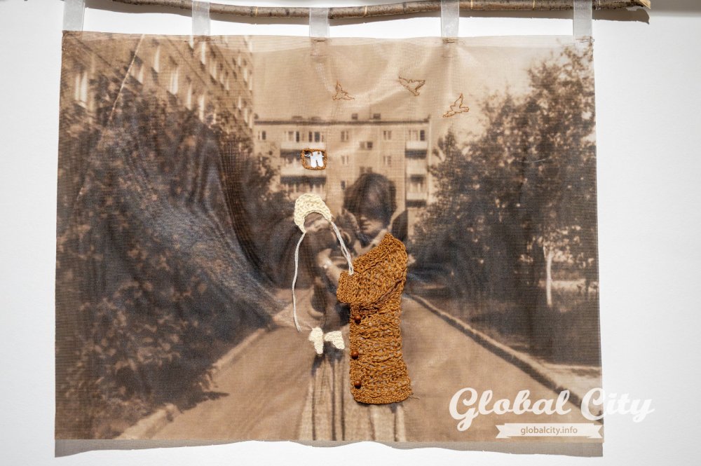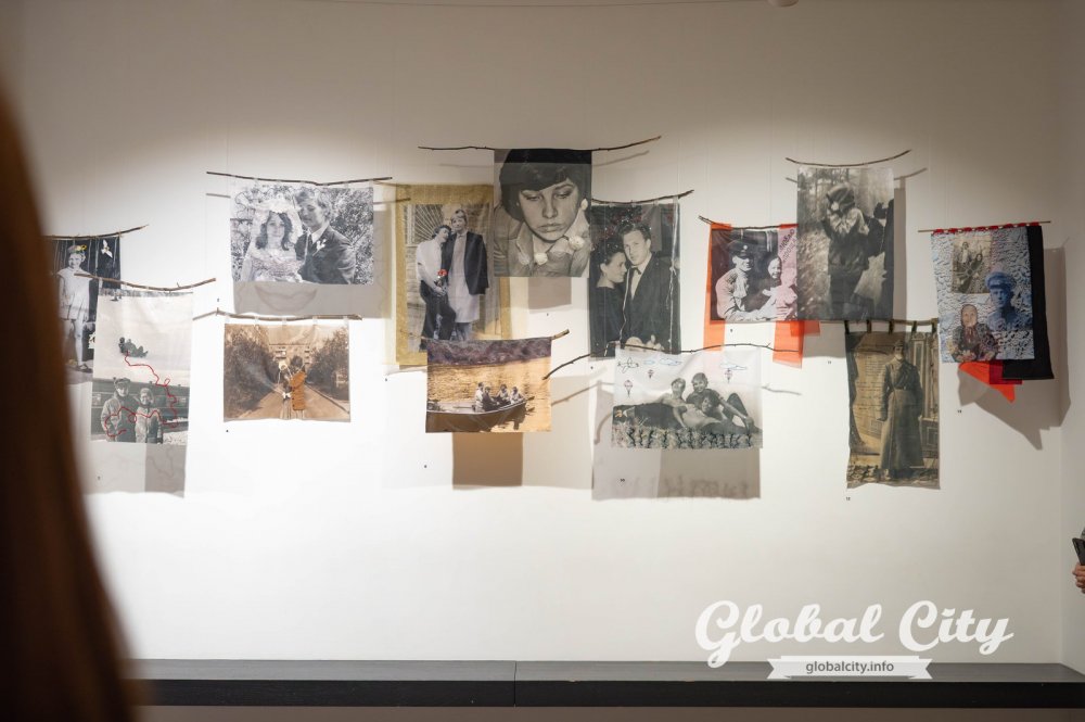 Экспозиция разделена на три тематических блока, каждый из которых исследует память через разные образы. Полотна-воспоминания – фотографии из семейных архивов, напечатанные на полупрозрачной ткани. Они колышутся от малейшего движения воздуха, создавая ощущение ускользающего момента. Работы дополнены вышивкой, лентами и закреплены на природных ветках – символах семейного древа.
